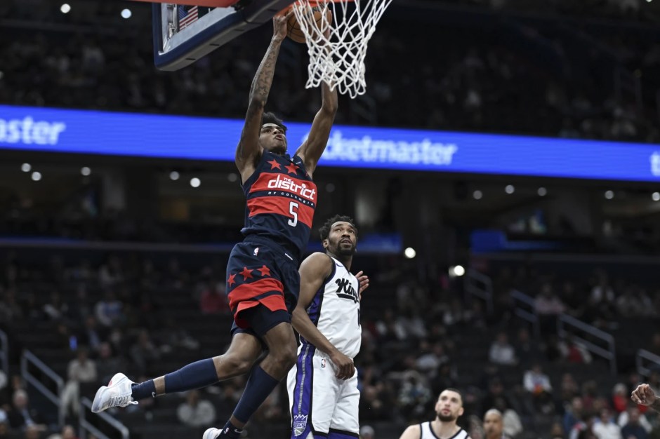 Washington Wizards guard AJ Johnson (5) dunks the ball as the Sacramento Kings guard Molik Monk (right) looks on in the first half at the Capital Center in Washington DC on Wed Apr 2, 2025 (AP News photo)