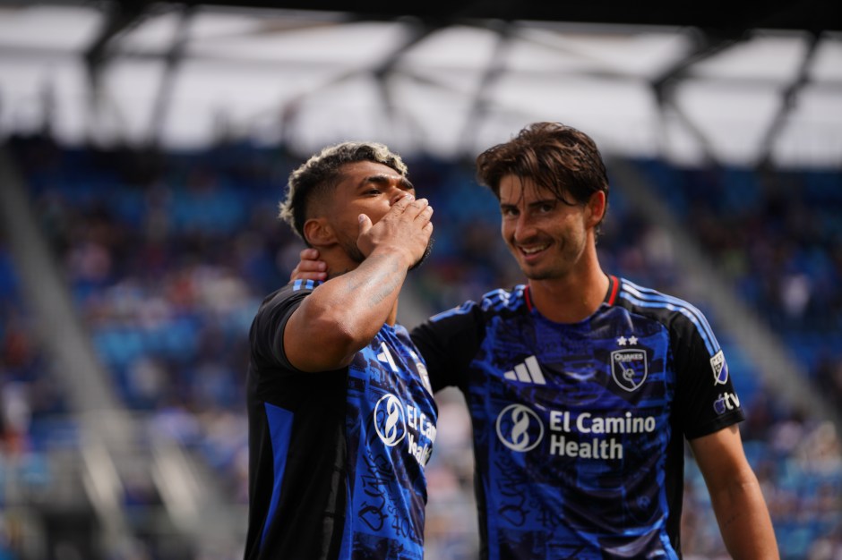 San Jose Earthquakes striker Josef Martinez blows a kiss to the crowd at Pay Pal Park as he celebrates one of his three goals with teammate and fullback Ian Harkes against DC United on Sunday APR 6, 2025. (San Jose Earthquakes)