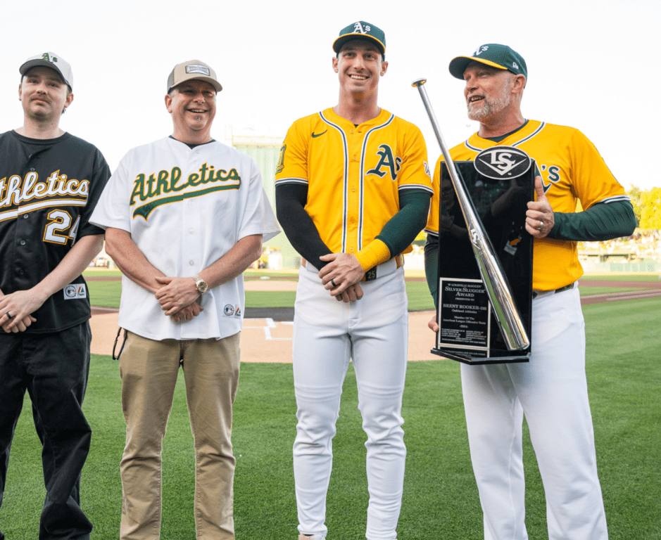 Brent Rooker receives his Silver Slugger from the 2024 season. (Photo: Athletics on X)