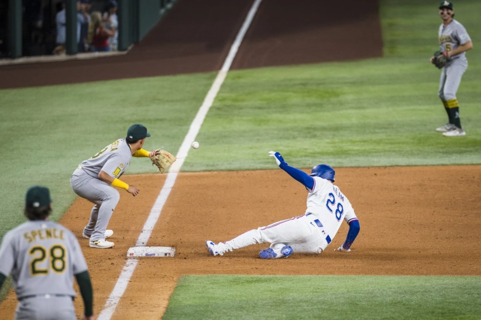 The Texas Rangers Jonah Heim (28) slides into third base before the ball is thrown to Sacramento A’s third baseman Gio Urshela (13) in the bottom of the seventh inning on Mon Apr 28, 2025 (AP News photo)
