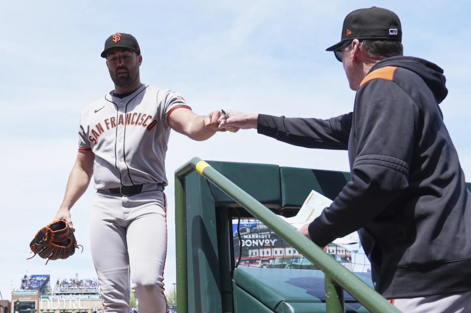 San Francisco Giants manager Bob Melvin (right) congratulates starting pitcher Robbie Ray (left) as he returns to the dugout after the first inning after retiring the Chicago Cubs at Wrigley Field in Chicago on Wed May 7, 2025