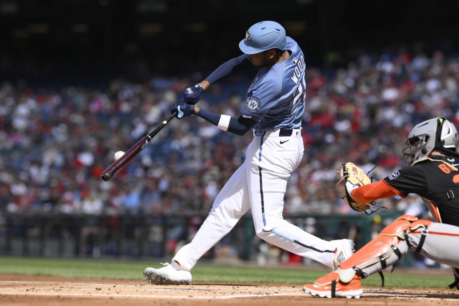 James Wood puts good wood on the baseball for a two run home run for the Washington Nationals against the San Francisco Giants in the bottom of the first inning at Nationals Park in Washington DC on Sat May 24, 2025 (AP News photo)