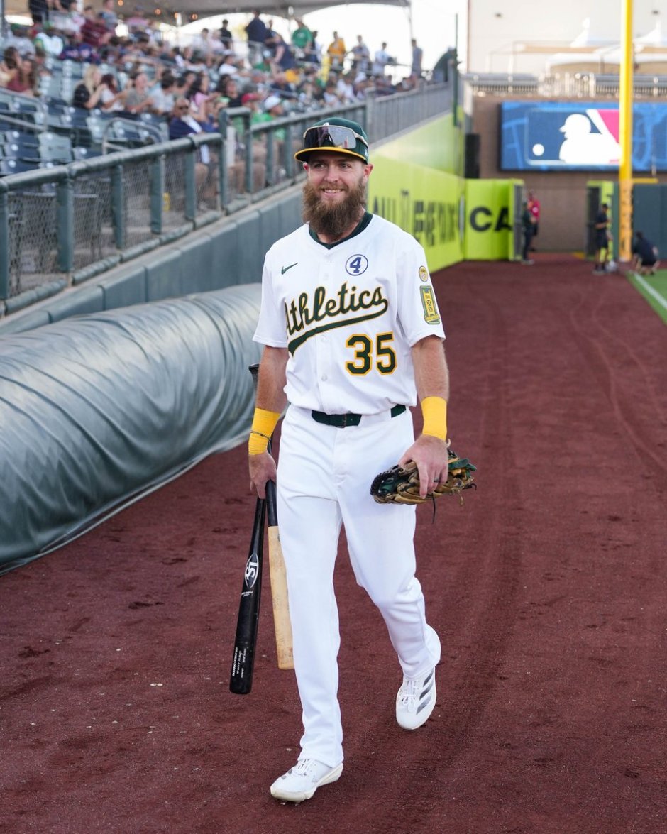 Sacramento A’s left fielder Drew Avans (35) who scored a run and got a hit against the Minnesota Twins on Mon Jun 2, 2025 is seen here preparing for the game at Sutter Health Park in Sacramento (Sacramento A’s X photo)
