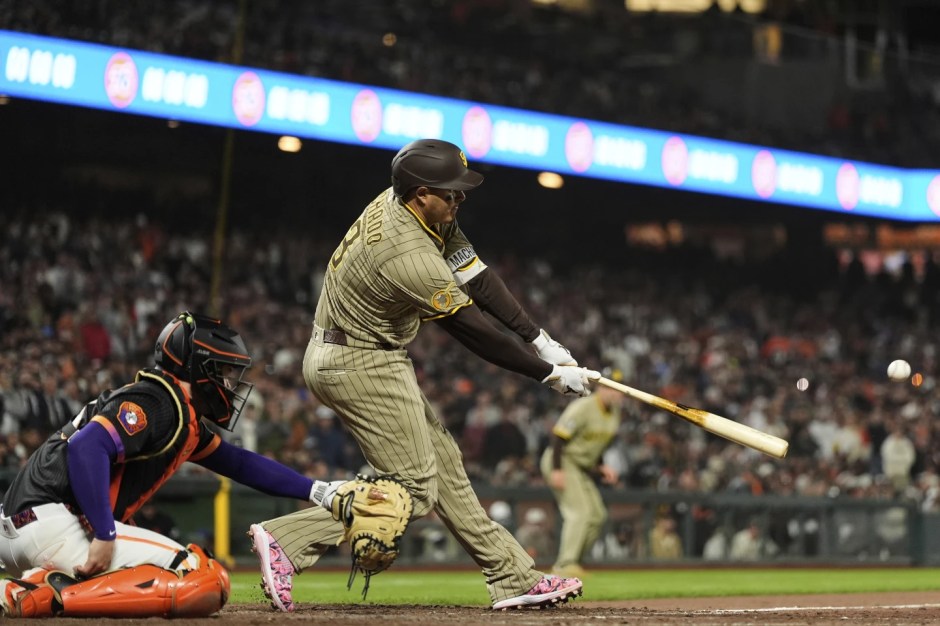 San Diego Padres Manny Machado swings at a low pitch for a ninth inning two run RBI single against the San Francisco Giants at Oracle Park in San Francisco on Tue Jun 3, 2025 (AP News photo)