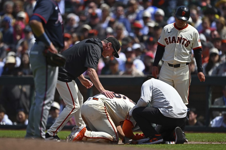 San Francisco Giant Matt Chapman (26) comes up injured after diving into first base as he’s checked on by manager Bob Melvin (black hoodie), team trainer Anthony Reyes, first base coach Mark Hallberg (91), and Atlanta Braves first baseman Matt Olson (28) on Sun Jun 8, 2025 at Oracle Park in San Francisco (AP News photo)