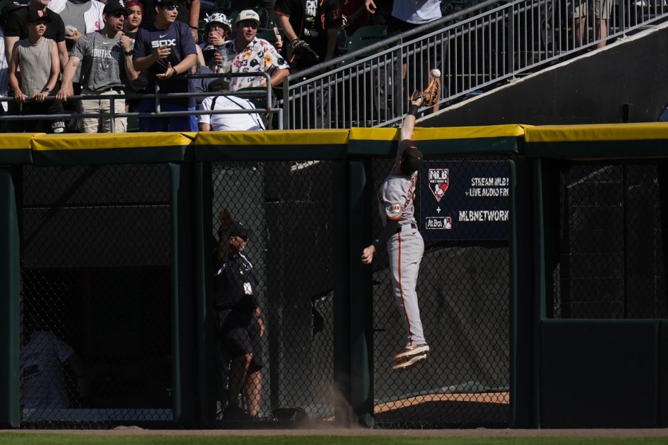 San Francisco Giant outfielder Mike Yastrzemski (5) just misses catching the Chicago White Sox Andrew Benintendi’s home run in the bottom of the sixth inning at Rate Field in Chicago on Sat Jun 28, 2025 (AP News photo)