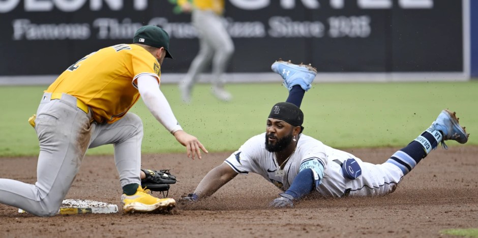 Tampa Bay Rays Junior Caminero (right) gets in ahead of the tag by the Sacramento A’s third baseman Max Schuemann (left) during a double in the bottom of the sixth inning at George M Steinbrenner Stadium in Tampa Bay on Wed Jul 2, 2025 (AP News photo)