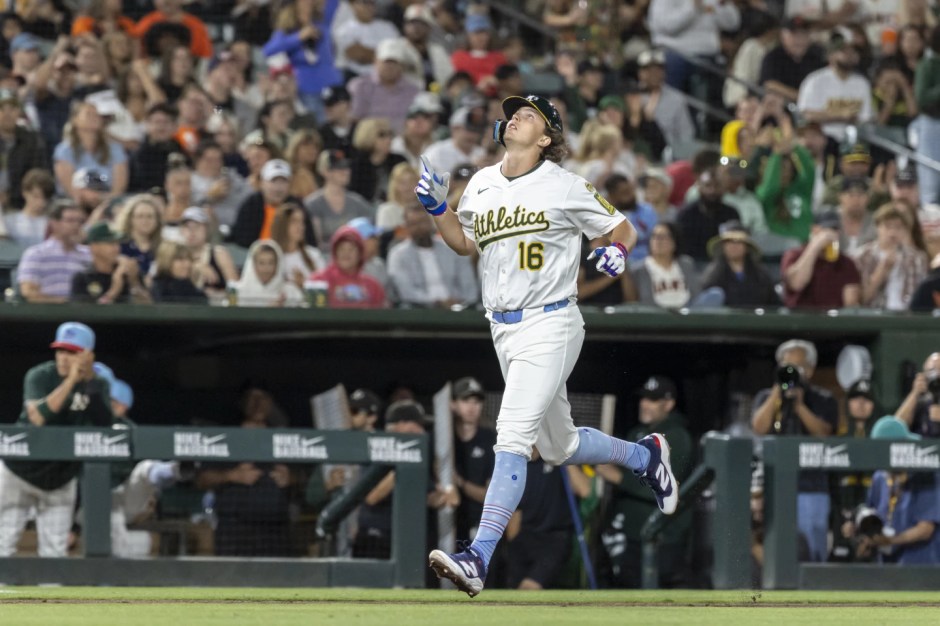 Sacramento A’s Nick Kurtz looks skyward after hitting a two run home run in the bottom of the sixth inning against the San Francisco Giants at Sutter Health Park in West Sacramento (AP News photo)