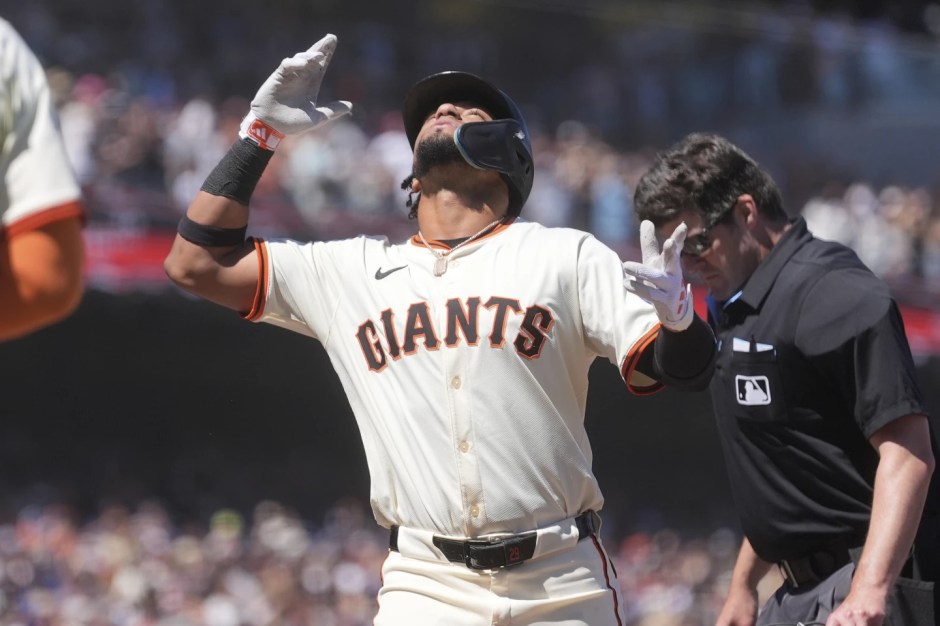 San Francisco Giants pinch hitter Luis Matos two run home run in the ninth inning celebration would be short lived Matos tied the game up but the Los Angeles Dodgers would come back in the the top of the 11th inning with three runs to defeat the Giants at Oracle Park in San Francisco on Sun Jul 13, 2025 (AP News photo)