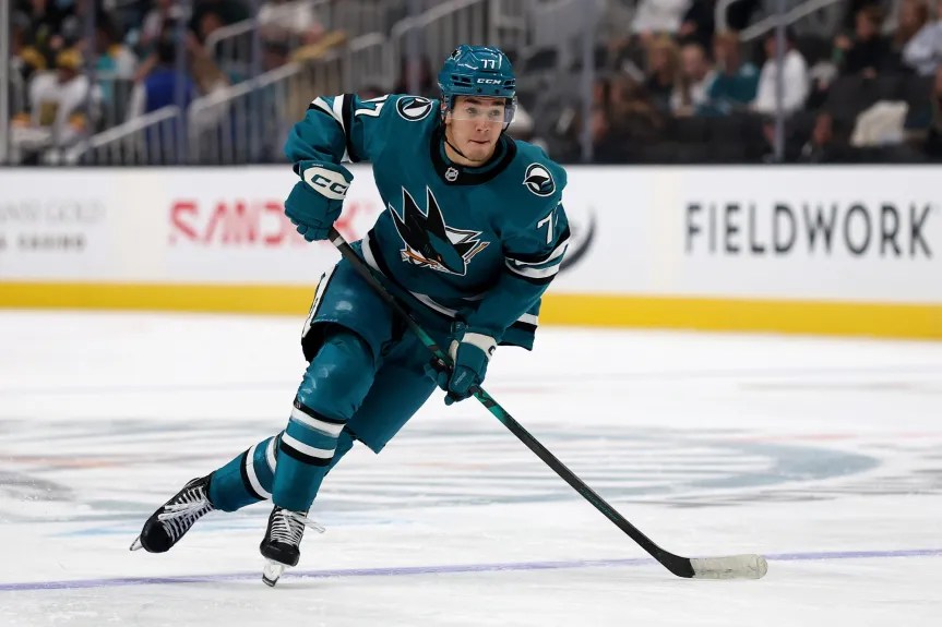 Michael Misa #77 of the San Jose Sharks skates on the ice during their preseason game against the Vegas Golden Knights at SAP Center on Sept. 26, 2025 in San Jose, California. (Photo by Ezra Shaw/Getty Images)