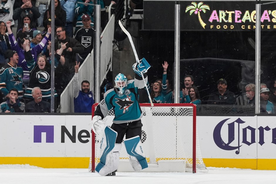 Yaroslav Askarov celebrates the win against the LA Kings at SAP Center on Nov 20, 2025, Courtesy of the San Jose Sharks.