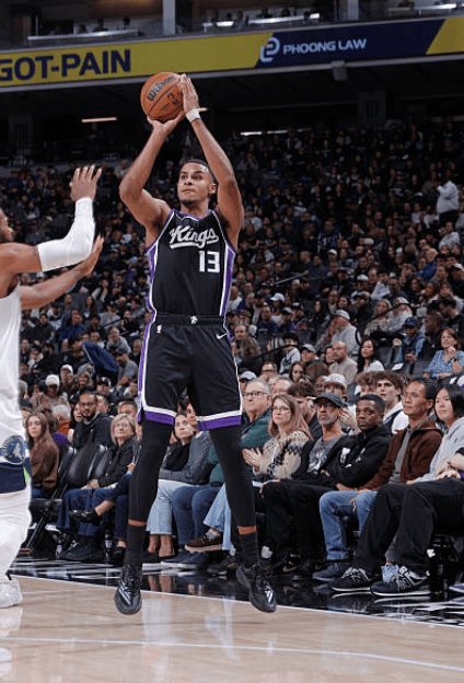 Keegan Murray #13 of the Sacramento Kings three point basket against the Minnesota Timberwolves on November 24, 2025 at Golden 1 Center in Sacramento, California. (Mandatory Photo Credit: Rocky Widner/NBAE via Getty Images)