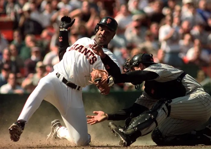 Former San Francisco Giant outfielder Barry Bonds once walked with the bases loaded on May 28, 1998 against the Arizona Diamondbacks. Here is Bonds in action trying to score at the plate at Candlestick Park. (USA Today file photo)