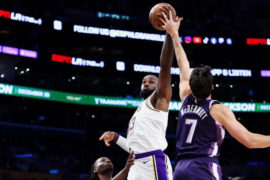 Los Angeles Lakers forward LeBron James (23) takes the ball away from the Sacramento Kings forward Precious Achiuwa (left) and forward Doug McDermott (7) at Crypto.com Arena in Los Angeles on Sun Dec 29, 2025 (AP News photo)