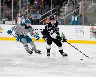 San Jose Barracuda left wing Egor Afanasyev (11) gives chase of Ontario Reign defenseman Otto Stalin (10) in AHL action at Tech CU in San Jose on Sat Dec 27, 2025 (San Jose Barracuda X photo)