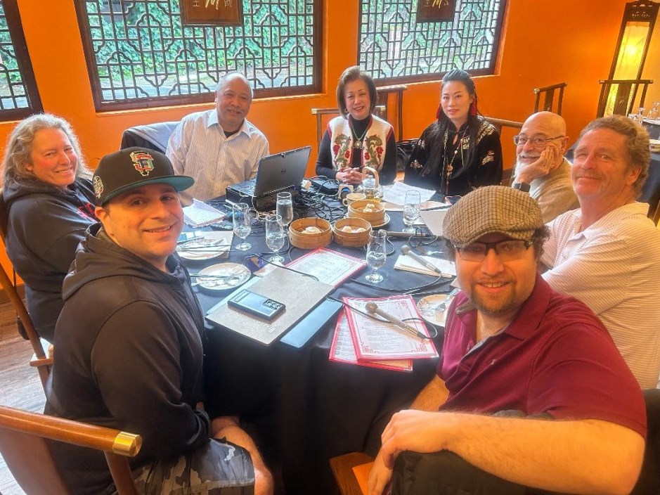Empress M Napa podcast cast: In SF Giants hat going right Vince Cestone (social media), Stephen Ruderman (Cal Bears podcaster and beat writer), Michael Wagaman (Associated Press), Michael Duca (ESPN/Host), Coquito Cao (Empress M general manager), Margaret Wong (Empress M owner), Lee Leonard Wong (producer), and Mary Lisa Walsh (San Jose Sharks beat writer). Photo by Daisy Amaya-Sports Radio Service advertising