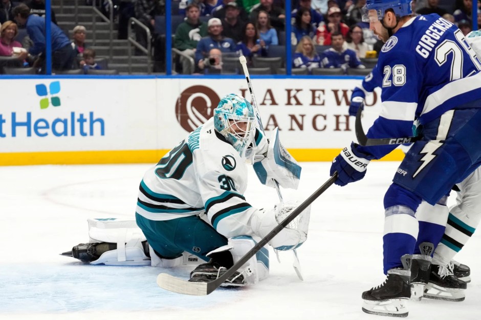 San Jose Sharks goaltender Yaroslav Askarov (30) makes a stop on the Tampa Bay Lightning center Zemgus Girgensons (28) in the second period at Benchmark International Arena in Tampa FL on Tue Jan 20, 2026 (AP News photo)