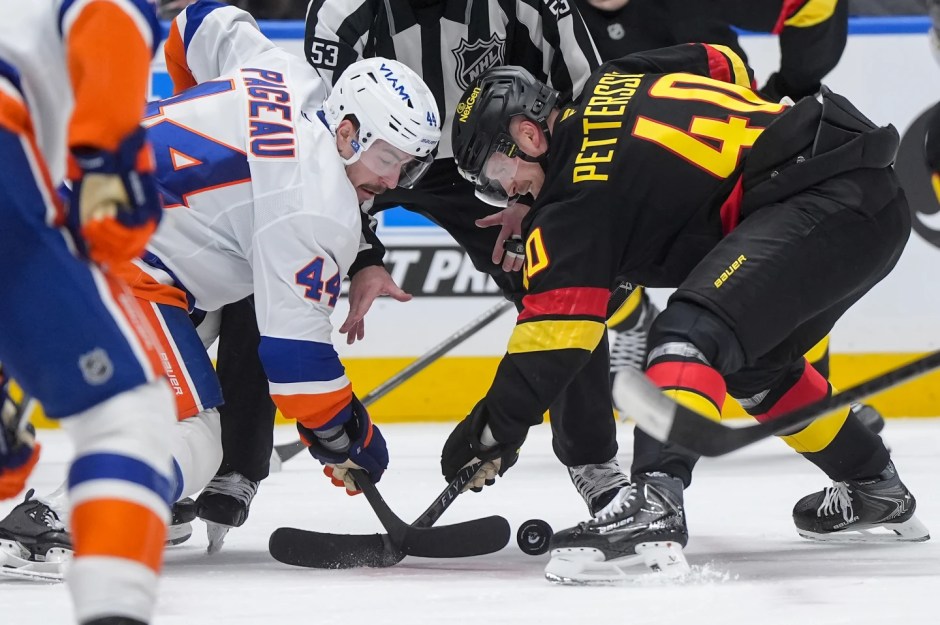 The Vancouver Canucks Elias Pettersson (40) wins a face off against the New York Islanders Jean Gabriel Pageau (44) at Rogers Centre in Vancouver on Mon Jan 19, 2026. The Canucks are on an 11 game loss streak and host the Washington Capitals on Wed Jan 21, 2026 (Canadian Press via AP)