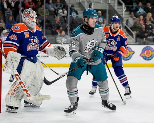 San Jose Barracuda forward Igor Chernyshov (92), Bakersfield Condors goaltender Connor Ungar (40) and defenseman Riley Stillman (61) anticipate the puck at Tech CU Sat Jan 24, 2026 (photo by San Jose Barracuda)