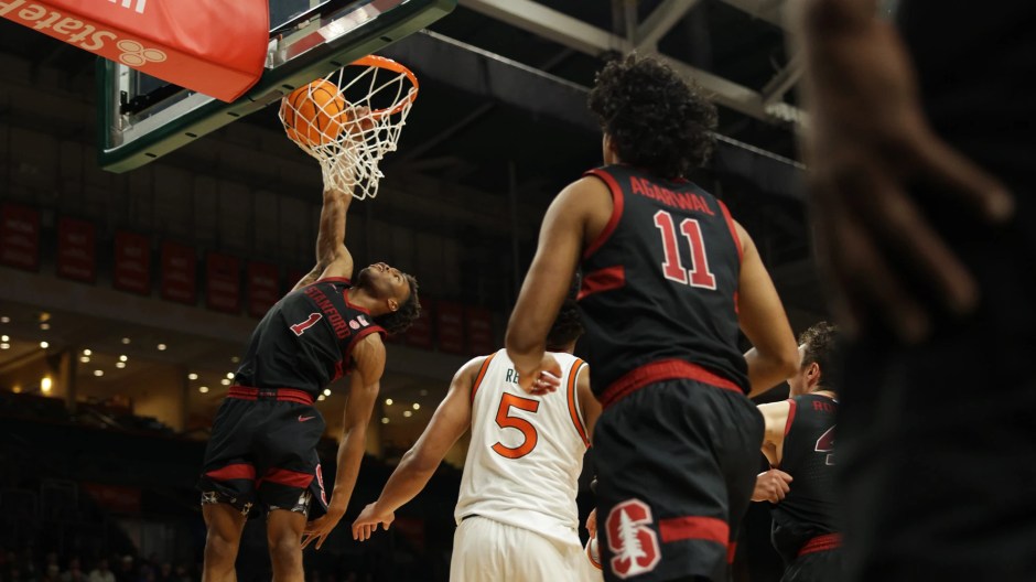 Stanford Cardinal Ebuka Okorie dunks on the Miami Hurricane at the Watsco Center in Miami on Wed Jan 29, 2026 (Stanford Cardinal photo)