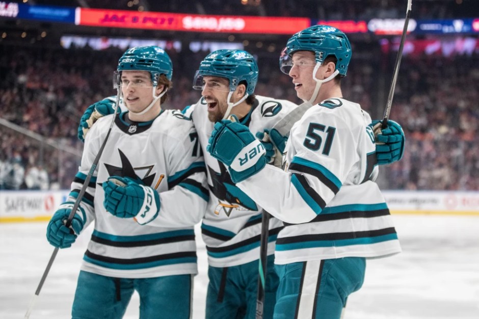From left to right the San Jose Sharks Macklin Celebrini, Mario Ferrerao, and Collin Graf celebrate a goal in the first period at Rogers Place in Edmonton on Thu Jan 29, 2026 (Canadian Press via AP)