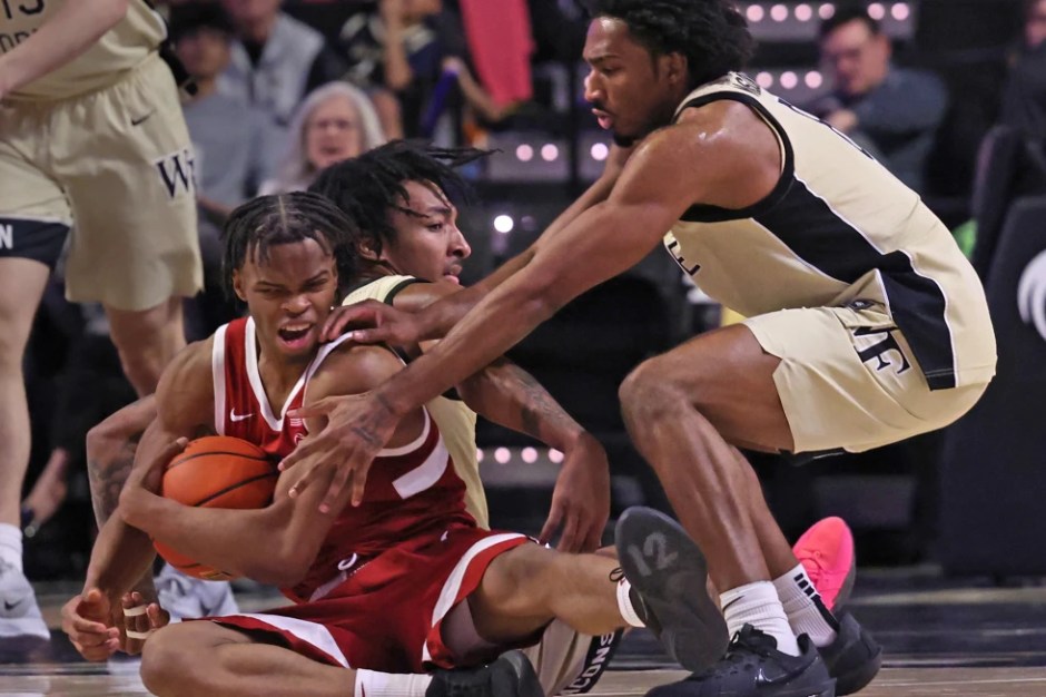 Stanford Cardinal Ebuki Okorie (1) hangs onto the basketball while the Wake Forest Demon Deacons Mehki Mason (right) reaches in and Juke Harris is seated behind Okorie at the Lawrence Joel Veterans Memorial Coliseum in Winston-Salem NC on Sat Feb 14, 2026 (AP News photo)