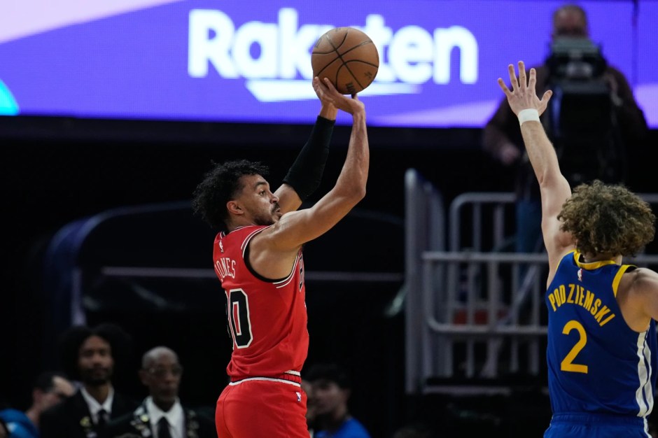 Golden State Warriors guard Brandin Podziemski (2) tries to put the shot block on the Chicago Bulls guard Tre Jones (left) who connects with a three point shot in the first half at the Chase Center in San Francisco on Tue Mar 10, 2026 (AP News photo)