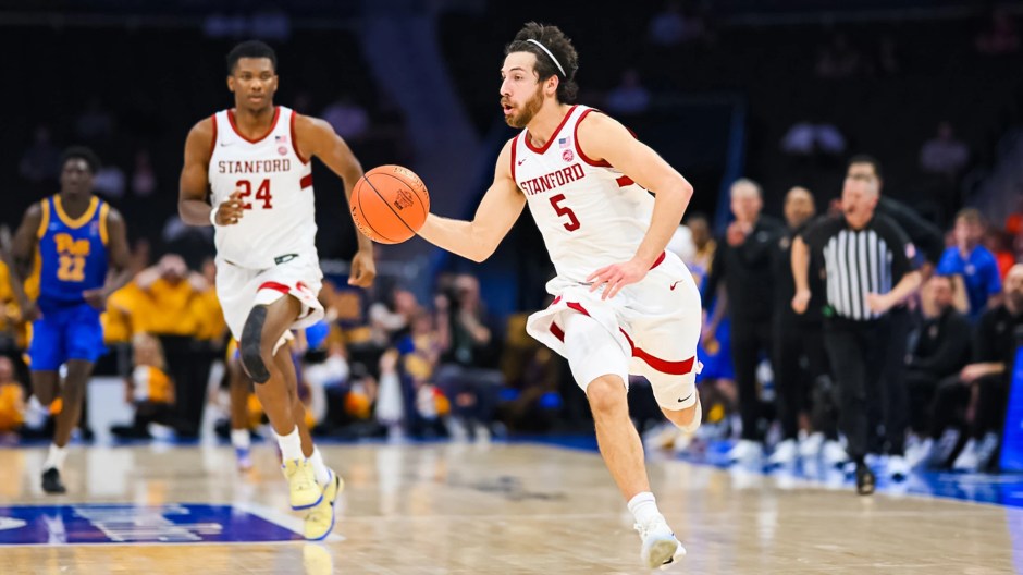 Stanford Cardinal Benny Gealer (5) takes the ball up the floor against the Pitt Panthers at the ACC Tournament in Charlotte NC on Tue Mar 10, 2026 (Stanford Cardinal photo)