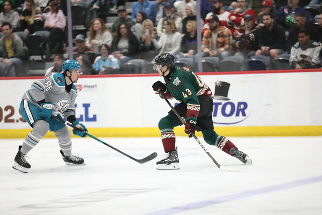 San Jose Barracuda Braden Hache defenseman (86) and the Tucson Roadrunners forward Jullan Lutz (43) facing off at the Tucson Convention Center in Tucson on Sun Mar 16, 2026 (Tucson Roadrunners photo)