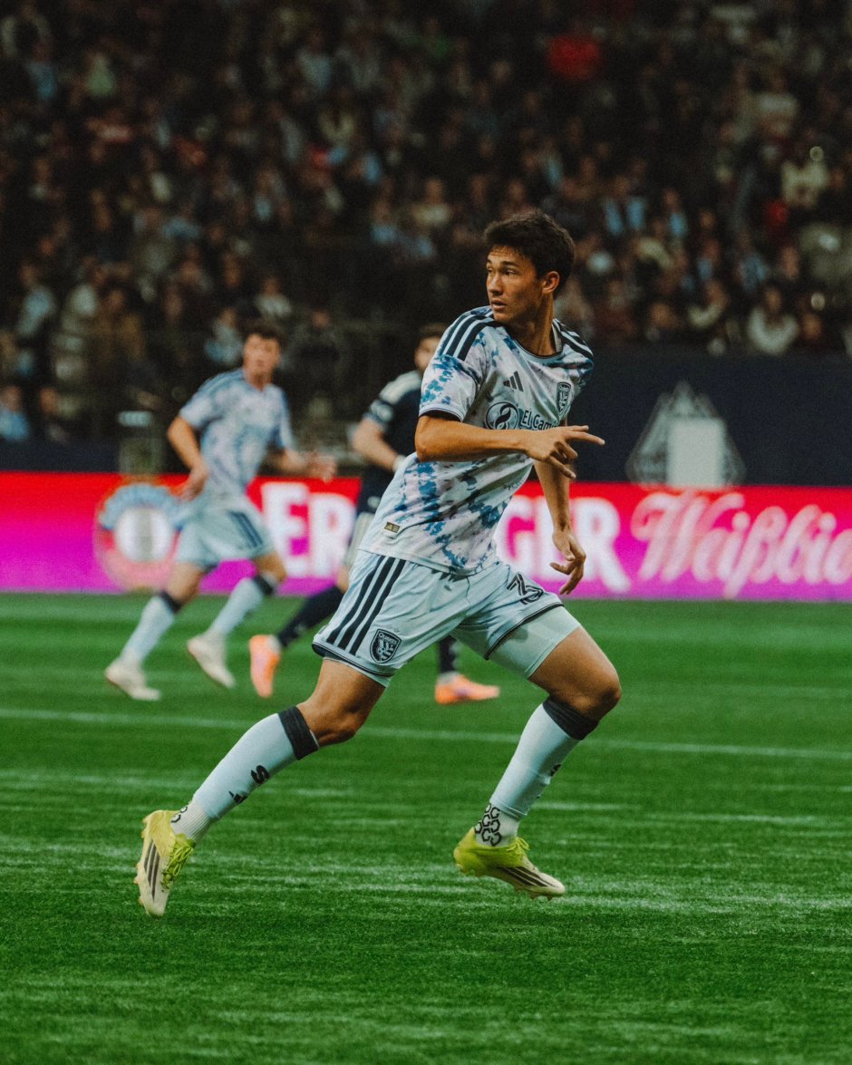 San Jose Earthquakes Beau Leroux (34) heads down field against the Vancouver Whitecaps at BC Place on Sat Mar 21, 2026 (San Jose Earthquakes photo)