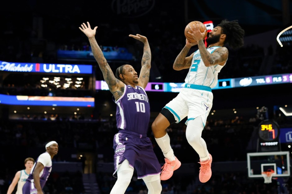 Charlotte Hornets guard Coby White (3) looks to take a shot against the Sacramento Kings guard DeMar DeRozan (3) in the first half at the Spectrum Center in Charlotte NC on Tue Mar 25, 2026 (AP News photo)
