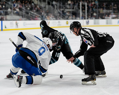 Colorado Eagles center TJ Tynan (9) and San Jose Barracuda forward Filip Bystedt (18) face off at Tech CU in San Jose on Sun Apr 5, 2026 (San Jose Barracuda photo)