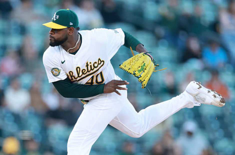 Luis Severino #40 of the Athletics pitches against the Texas Rangers in the first inning at Sutter Health Park on April 13, 2026 in Sacramento, California. (Mandatory photo credit: Ezra Shaw/Getty Images)