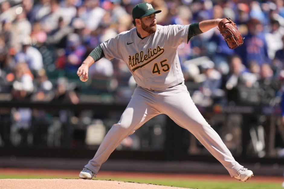 Sacramento A’s starter Aaron Civale delivers to the New York Mets line up at Citi Field New York on Sun Apr 12, 2026 (AP News photo)