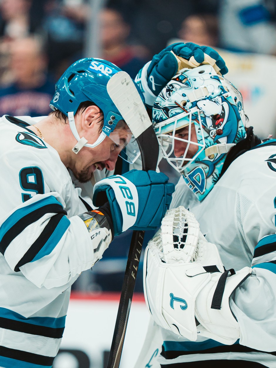 San Jose Sharks Dimitry Orlov (9) congratulates goaltender Alex Nedeljkovic (33) after defeating the Winnipeg Jets at the Canada Life Centre in Winnipeg on Thu Apr 16, 2026 (San Jose Sharks X photo)