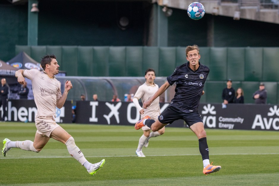 Oakland Roots forward Wolfgang Prentice heads the ball for a goal against FC Tulsa during the first half of a USL Championship match, Saturday, April 18, 2026, at the Oakland Coliseum in Oakland, Calif. (Bridget Whitaker – Sports Radio Service).