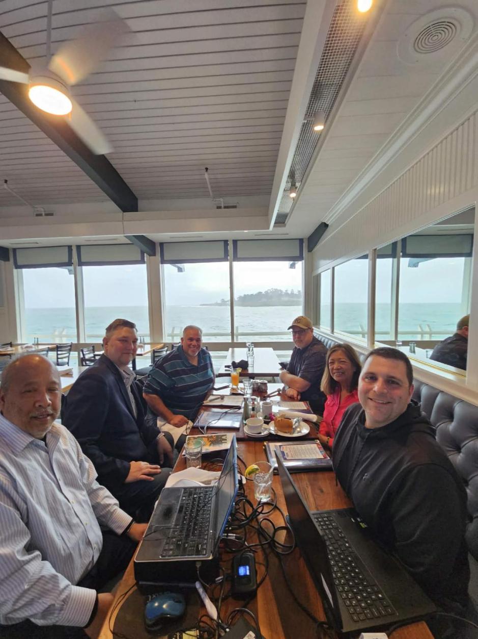 Firefish Seafood Grill Restaurant Santa Cruz/ Sportstalk cast: left side going left to right Lee Leonard (producer), Lance Haggard (owner partner & general manager Firefish), Marko Ukalovic (host/ SJ Earthquakes reporter), right side right to left Vince Cestone (SF Giants reporter), Daisy Amaya (advertising), Brien G (The Voice Santa Cruz radio) photo by Andrea-Firefish Seafood Restaurant server.