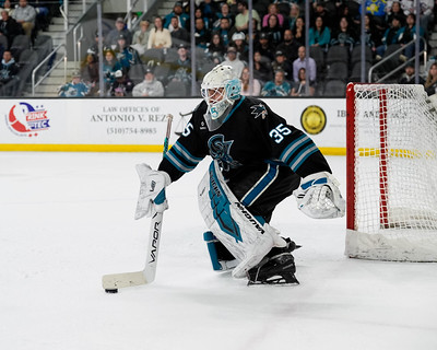 San Jose Barracuda goaltender Gabriel Carrierre (35) defends the net against the Bakersfield Condors at Tech CU in San Jose on Sat Apr 18, 2026 (San Jose Barracuda photo)