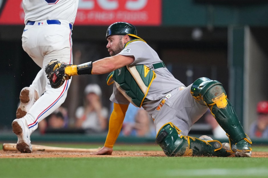 Sacramento A’s catcher Austin Winns (right) puts the late tag on Texas Rangers Danny Jansen (left) who scores on an RBI fly out hit by Brandon Nimmo in the last of the third inning at Globe Life Field in Arlington on Sat Apr 25, 2026 (AP News photo)