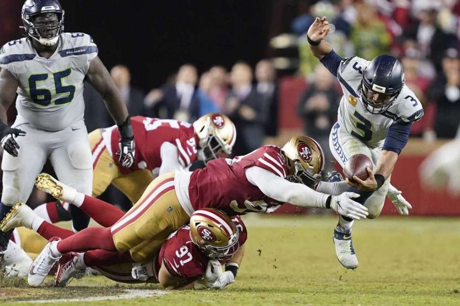 The pressure got to Rodgers early and often, as the Niners pass-rush hit him ten times, sacking him for five, and forced a fumble at his own 14 on the opening possession. Fred Warner was credited with the strip-sack, while Nick Bosa picked it up but got stopped short of scoring his first career touchdown at the two-yard-line.