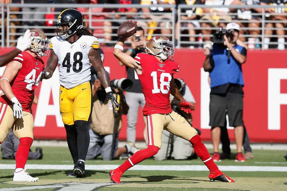 photo from sfgate.com: Dante Pettis #18 of the San Francisco 49ers celebrates after scoring a touchdown in the fourth quarter against the Pittsburgh Steelers at Levi’s Stadium on September 22, 2019 in Santa Clara, California