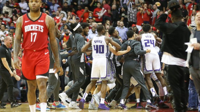The Sacramento Kings shocked the 18,055 fans at the Toyota Center in Houston — when with one-second left to go in the game — Nemanja Bjelica put up a 33-foot, 3-point jump shot that went in for the winning basket. The Kings players ran off the bench to mob Bjelica, while the Rockets stood around with mouths wide open trying figure out what had just happened.