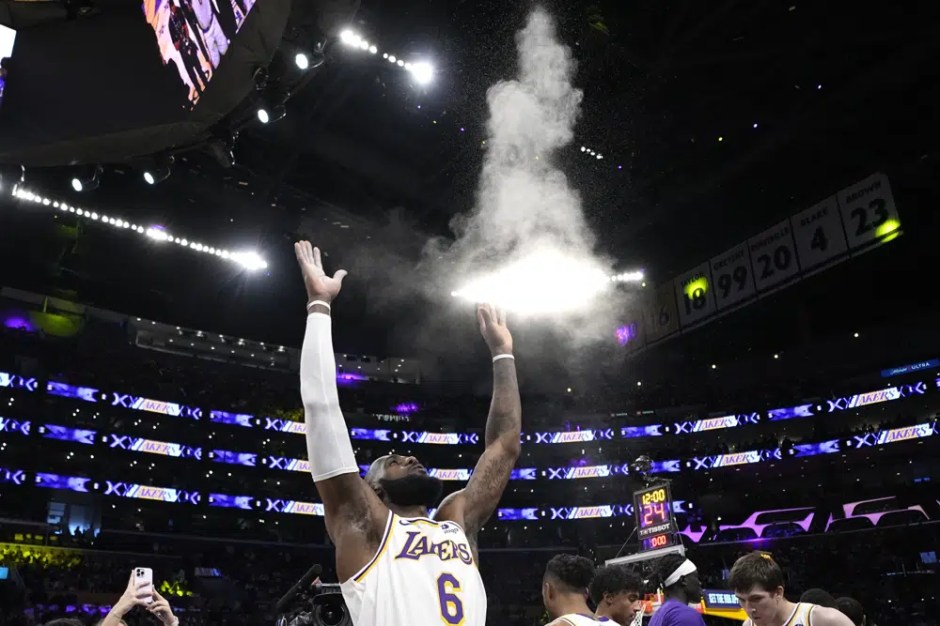 Los Angeles Lakers forward LeBron James (6) reacts after scoring during the second half in Game 6 of an NBA basketball Western Conference semifinal series against the Golden State Warriors Friday, May 12, 2023, in Los Angeles. (AP News photo)