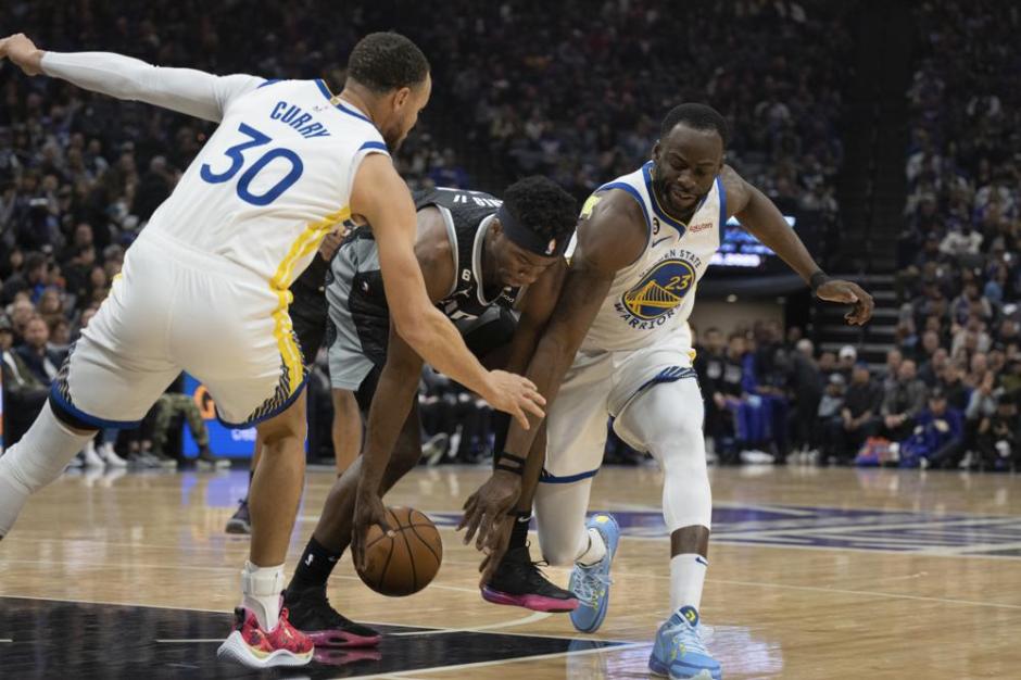 New Orleans Pelicans forward Herbert Jones, far left, and Golden State Warriors forward Draymond Green, far right, are separated after a scuffle during the second quarter at Chase Center in San Francisco on Tue Mar 28, 2023 (AP News photo)