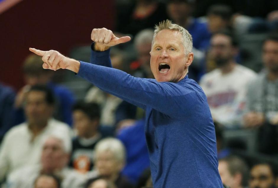 Golden State Warriors head coach Steve Kerr points the direction the Warriors should be shooting against the Detroit Pistons at Little Caser’s Palace in Detroit on Sun Oct 30, 2022 (AP News photo)