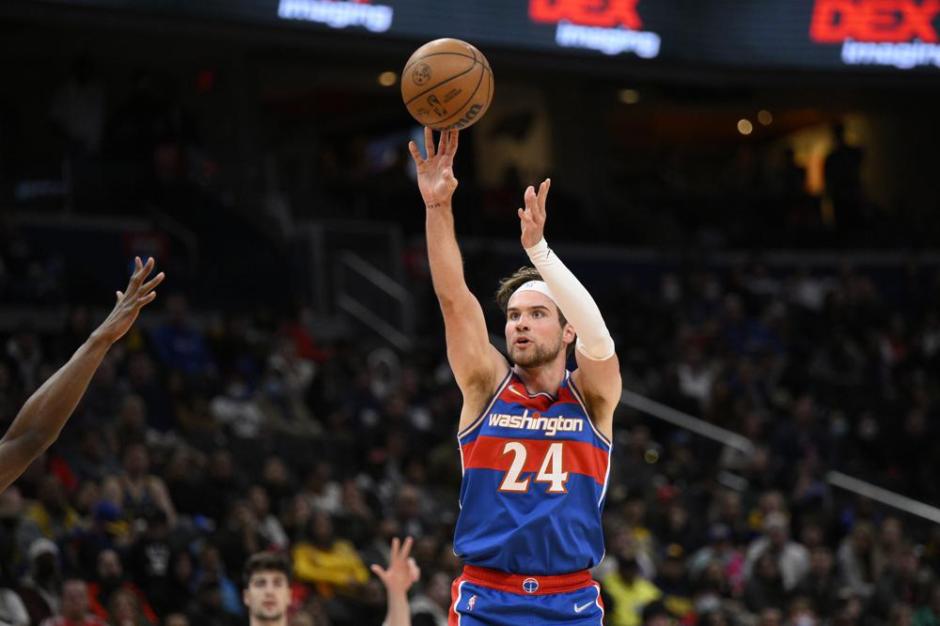 Washington Wizards forward Corey Kispert (24) takes a shot against the Golden State Warriors at the Capital One Center in Washington DC on Sun Mar 27, 2022 (AP News photo)