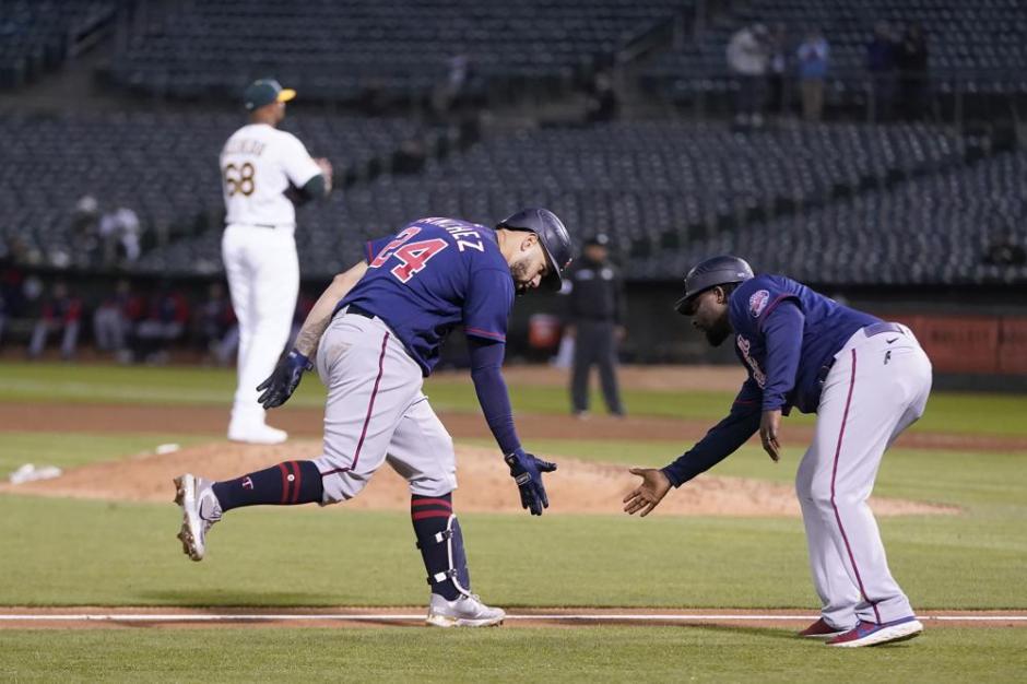 Minnesota Twins’ Gary Sanchez, bottom left, is congratulated by third base coach Tommy Watkins after hitting a home run off of Oakland Athletics pitcher Domingo Acevedo, rear at the Oakland Coliseum on Mon May 16, 2022 (AP News photo)
