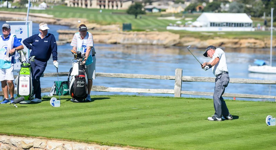 Steve Flesch gets the pictured Pure Insurance Championship Trophy Award at Pebble Beach on Sun Sep 25, 2022 (@PUREFirstTee photo)
