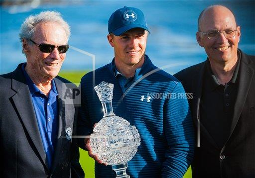 PEBBLE BEACH, CA – FEBRUARY 12: Jordan Spieth of the United States with Clint Eastwood and the director of Pebble Beach after the final round on February 12, 2017, at Pebble Beach Golf Links in Pebble Beach,CA (Photo by Samuel Stringer/Icon Sportswire) (Icon Sportswire via AP Images)