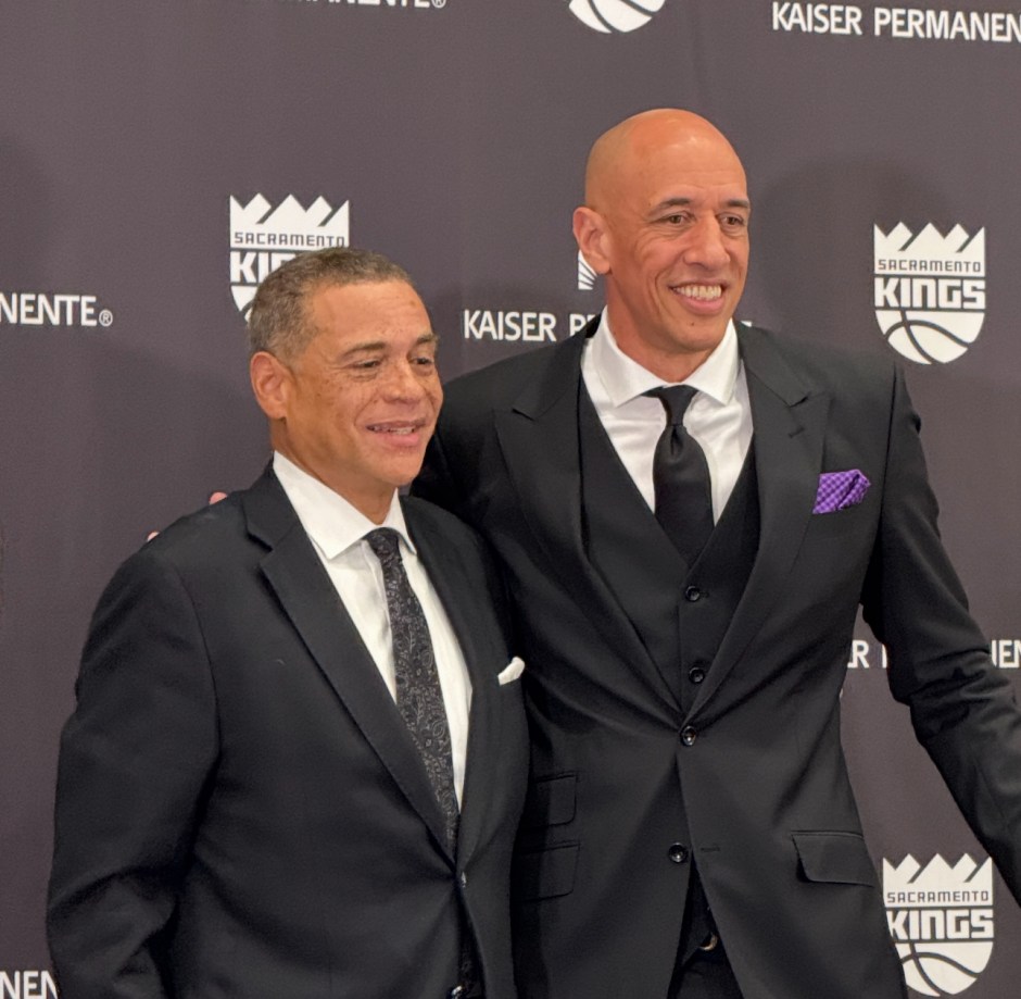 Dennis Schröder and Scott Perry at a press conference on Tuesday introducing the new Kings PG. (Photo: Sacramento Kings on X)